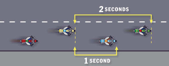 This means that in Group rides - if you are riding in "double" or "staggered" formation, the person directly ahead should be 2 seconds distance from you, and the person in the staggered position should be 1 second distance from you. PLUS, the persons behind you should be doing likewise - or they are guilty of "tail-gating", and we know what happens to people who tailgate.